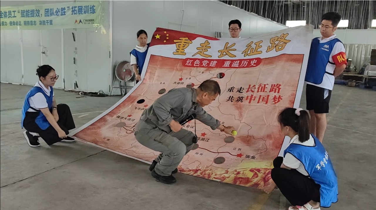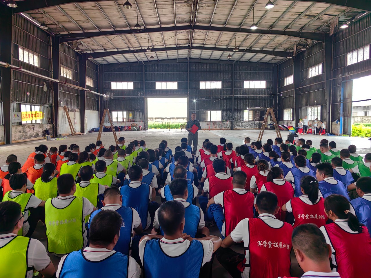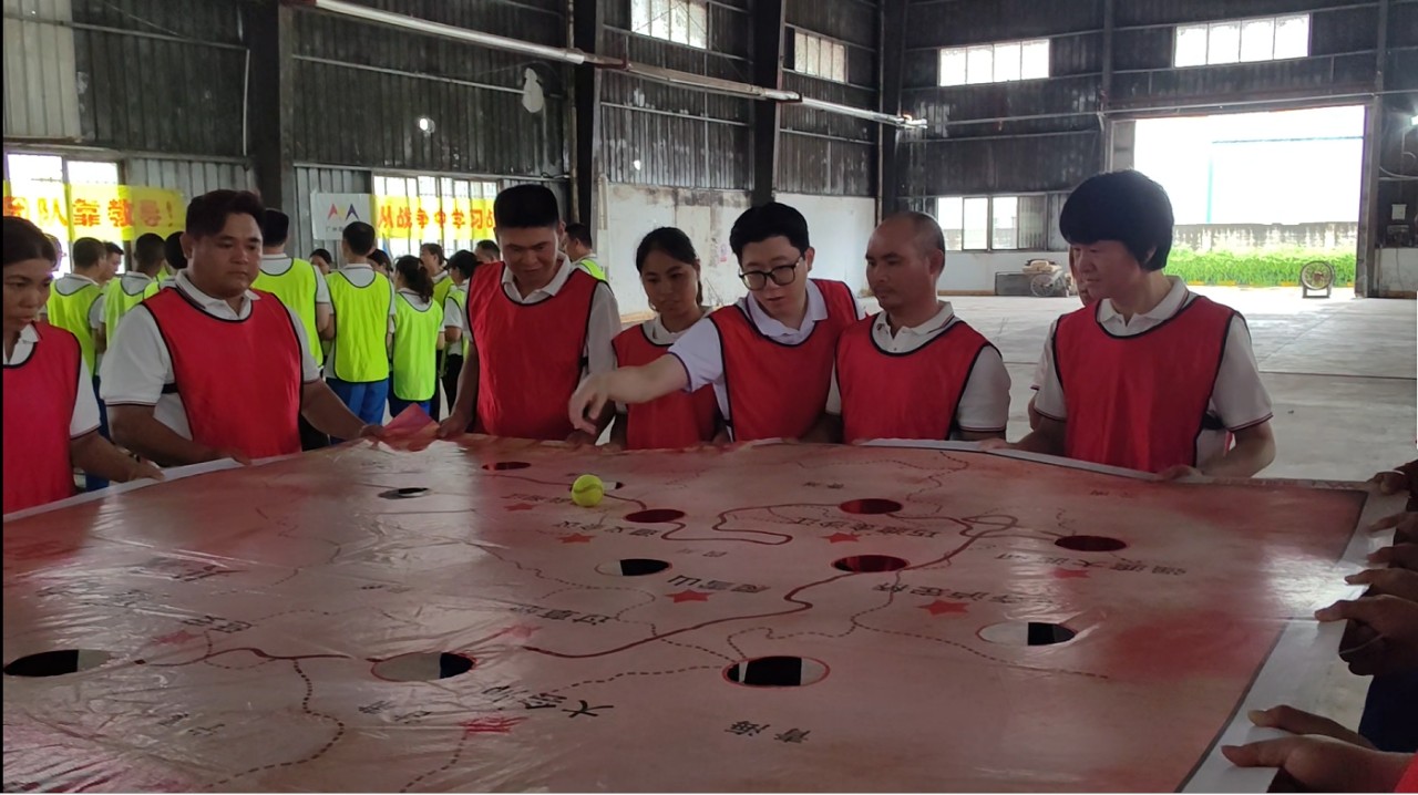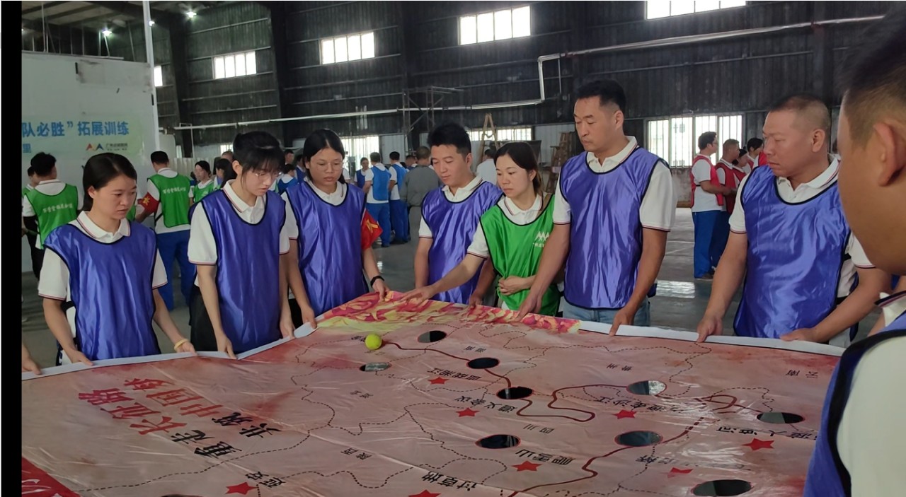 第一天上午,在张老师的指挥下,员工们快速组建了6个团队(分别是红军队、八路军队、新四军队、解放军队、志愿军队、特种兵队)。各队选出队长、政委,确定了口号和队形,并在张老师的指挥下开展《重走红军长征路》《沙场大战》拓展训练。
